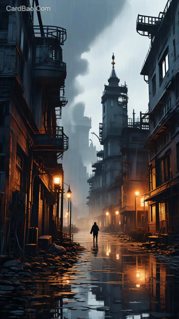 Novel illustration background, an industrial slum street under the glow of twilight, with damaged brick walls exposing copper pipes leaking steam. In the distance, the silhouette of a clock tower is visible (with broken and glowing hands). Cobblestone streets reflect oily puddles (with a rain and mist effect). A young man stands on the street, his shadow distorted into the shape of a sword (with low transparency). Faint blue fluorescent bloodstains lead toward the distant seaside. Buildings along the street feature peeling, faded posters and notices. The aesthetic is retro-punk, with diesel-punk decay, an emerging sense of mystery, the resilience of youth, and an undertone of hidden danger. Tactical poverty details, steam-era street survival, and cinematic chiaroscuro contrast.