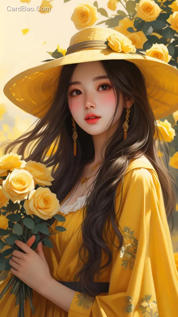 Beautiful girl with long hair, delicate facial features, wearing a yellow dress and a yellow hat, holding a bouquet of yellow roses against a yellow rose background, in a fresh, healing, and aesthetic style.
