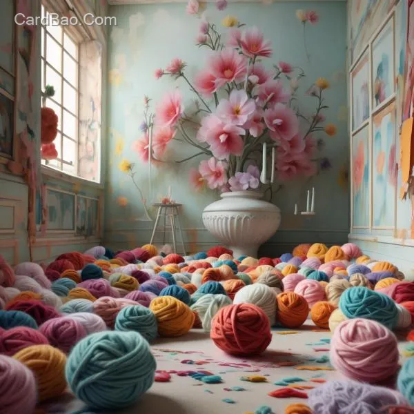 The floor of the eerie room is entirely covered with colorful yarn balls, sparking whimsical imagination.