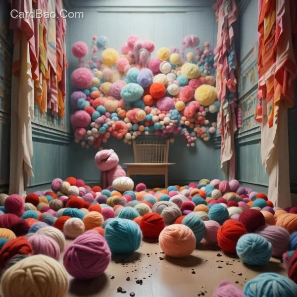 The floor of the eerie room is entirely covered with colorful yarn balls, sparking whimsical imagination.