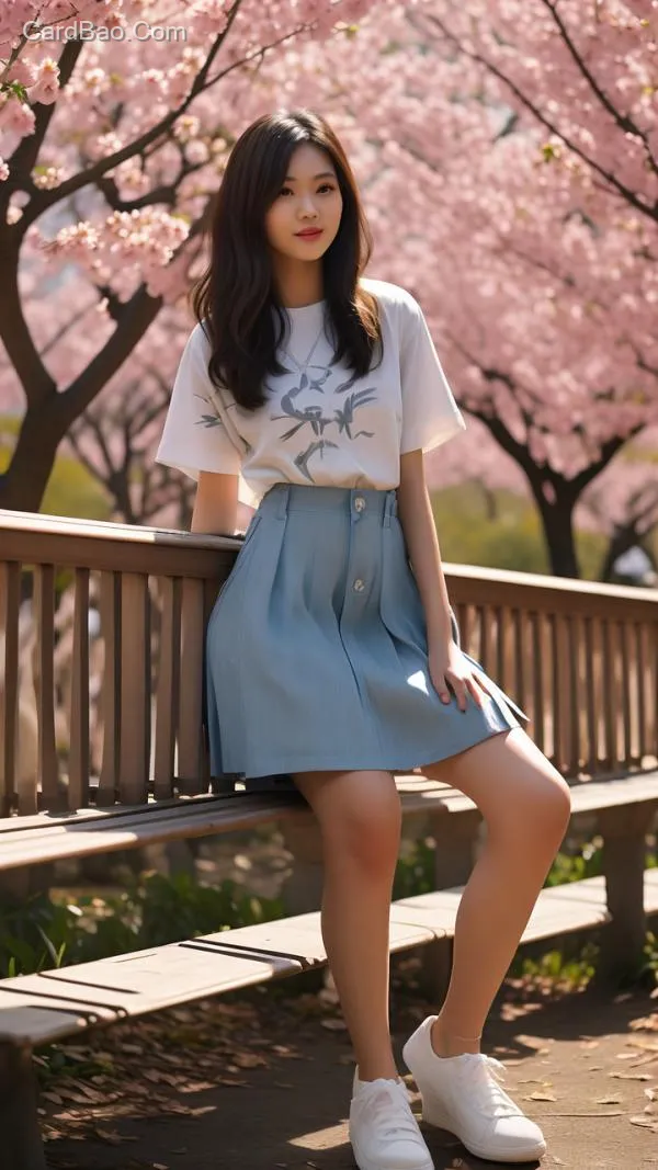 二十岁亚洲女孩,浅蓝色牛仔短裙带有毛边设计,裙长及大腿中部,上衣搭配宽松白色卡通印花T恤,斜挎帆布托特包。坐在公园长椅上双腿自然交叠,背景是盛开的粉色樱花树,阳光透过树叶形成光斑洒在裙面,白色运动鞋与中筒袜衬托青春活力,全身照捕捉动态自然感。 现实人物写真 人物全身照 现实相机拍摄人物写真 中国女人 皮肤白皙