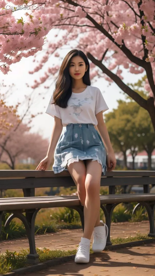 二十岁亚洲女孩,浅蓝色牛仔短裙带有毛边设计,裙长及大腿中部,上衣搭配宽松白色卡通印花T恤,斜挎帆布托特包。坐在公园长椅上双腿自然交叠,背景是盛开的粉色樱花树,阳光透过树叶形成光斑洒在裙面,白色运动鞋与中筒袜衬托青春活力,全身照捕捉动态自然感。 现实人物写真 人物全身照 现实相机拍摄人物写真 中国女人 皮肤白皙