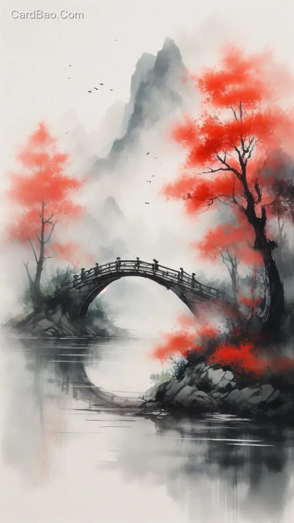 抽象艺术,中国水墨画,糅合艺术,江南水乡的春天。小桥流水人家。隐约雾状,色彩明媚。