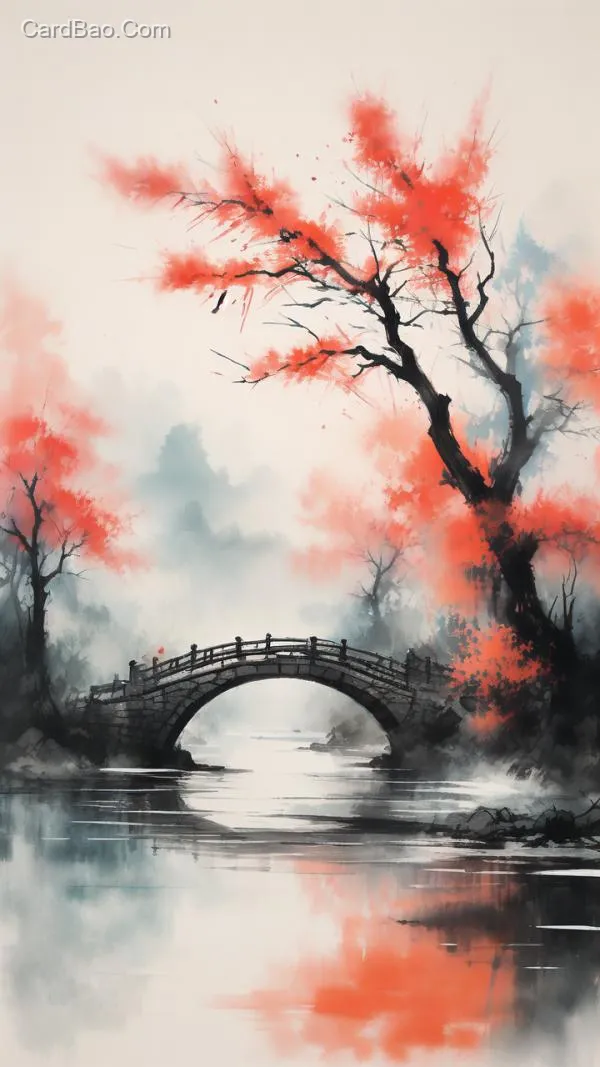 抽象艺术,中国水墨画,糅合艺术,江南水乡的春天。小桥流水风景。色彩明媚