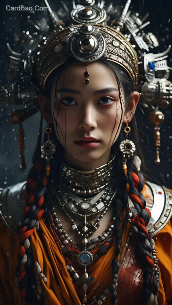 一位23-28岁的轻熟女,融合藏族风格,拥有独眼竖瞳、悬浮水晶王冠、不对称金属领口和机械仿生肩甲,展现出神秘残缺美的危险气质。