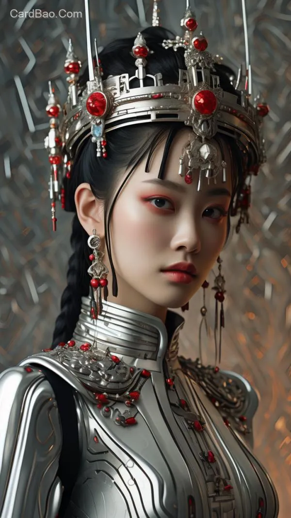 一位23-28岁的轻熟女,融合赛博朋克与古典美学,拥有紫金色异瞳、悬浮水晶王冠、不对称金属领口和机械仿生肩甲,展现出神秘残缺美的危险气质。