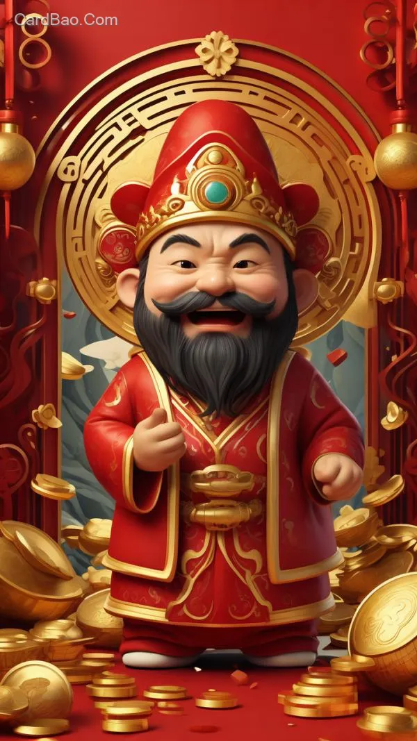 C4D,3d,新年海报设计!喜庆,纯红色的背景,让人感觉热烈又充满活力,金色的字体闪闪发光,真是醒目又喜庆,门半开着,从里面探出一个穿着传统中国服饰的财神,头戴红色帽子,上面还有金色的装饰,身穿红色长袍,腰间系着金色腰带,腰带上还有一个圆形的装饰物,真是可爱极了!财神的手拿着金元宝,向大家打招呼,表情非常友好和开心,元宝,金币