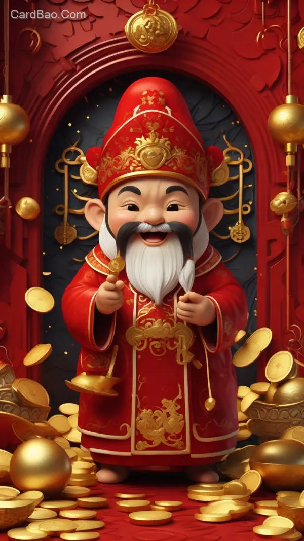 C4D,3d,新年海报设计!喜庆,纯红色的背景,让人感觉热烈又充满活力,金色的字体闪闪发光,真是醒目又喜庆,门半开着,从里面探出一个穿着传统中国服饰的财神,头戴红色帽子,上面还有金色的装饰,身穿红色长袍,腰间系着金色腰带,腰带上还有一个圆形的装饰物,真是可爱极了!财神的手拿着金元宝,向大家打招呼,表情非常友好和开心,元宝,金币