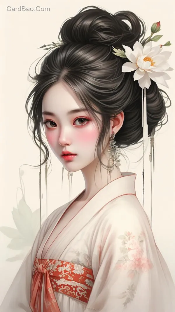 Oriental beauty avatar, with a charm that outshines the present and the past, making even the lotus flower shy before her jade-like complexion, in a minimalist cartoon style.