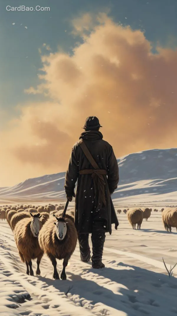20岁的青年,身高1.7米。在中国东北放绵羊。冬季白雪铺地。只有我孤独地头戴貂皮帽,身穿着老式深黄绿色棉大衣,领子是薄薄的深棕色人造绒毛。大衣长度刚到膝盖,下面露出黑色的棉裤。棉鞋也是黑色的。在零下三十多度的天气里,徒步赶着一群300多只的羊,走在开阔雪地上,远处朝阳刚刚升起,显出浅红色的云朵。画面要开阔,我身后一群绵羊。