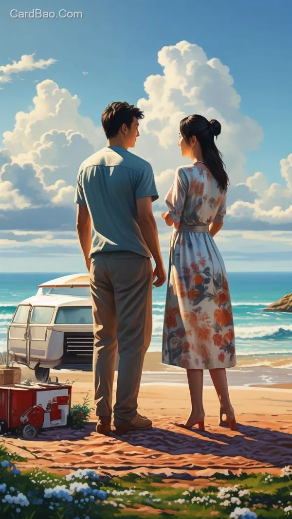 彼此深爱的夫妻背景是蓝天白云海景房,房车,