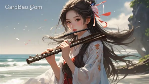 Seaside, girl playing flute, dress, long hair