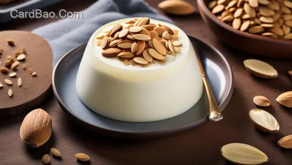Food display, milk pudding, almonds, commercial advertising photography, high definition.
