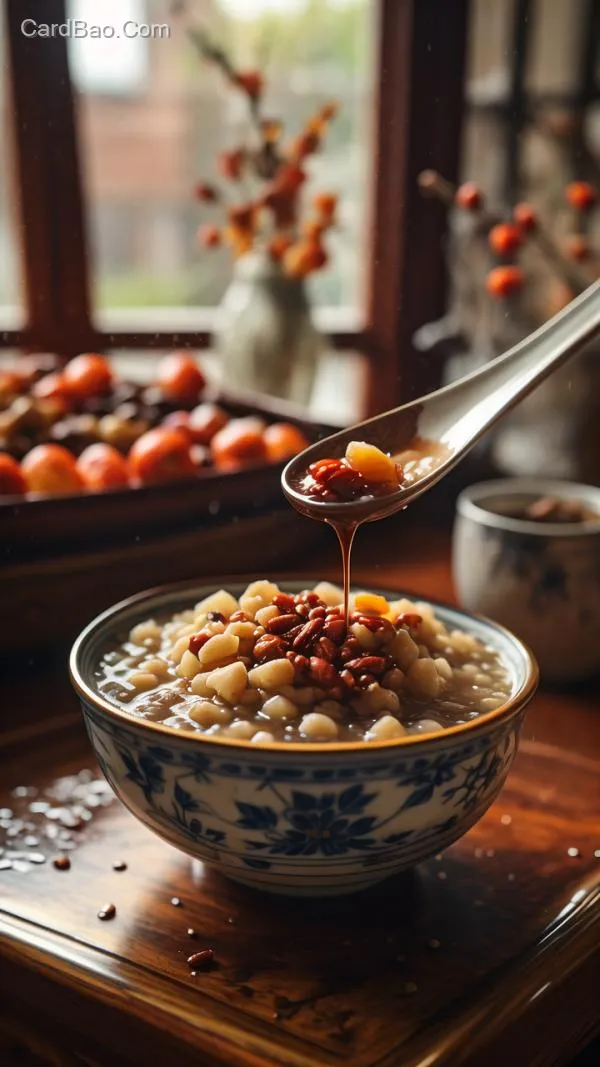 A bowl of Laba porridge is placed on a beautiful table.