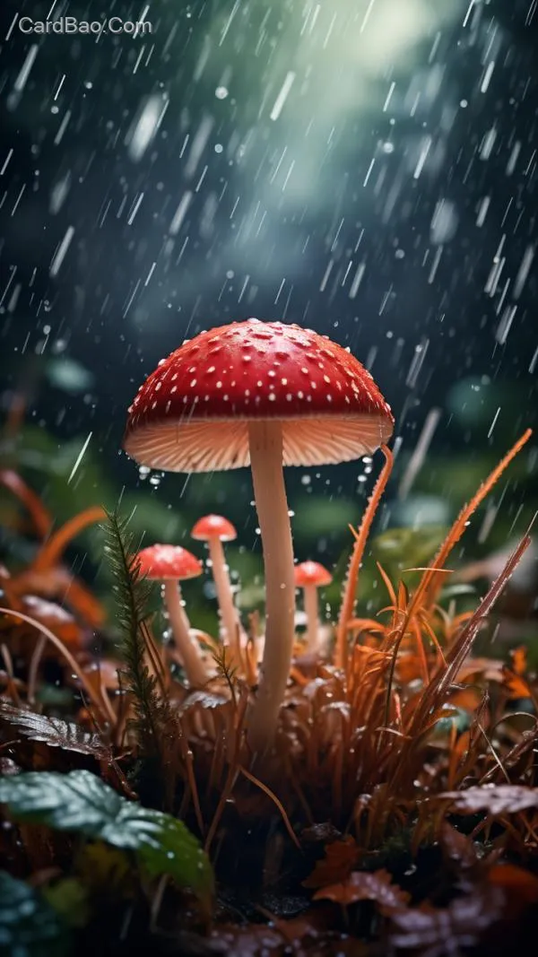 森林秘境,蘑菇,暴雨,低角度仰拍,微距镜头,高清晰,电影打灯
