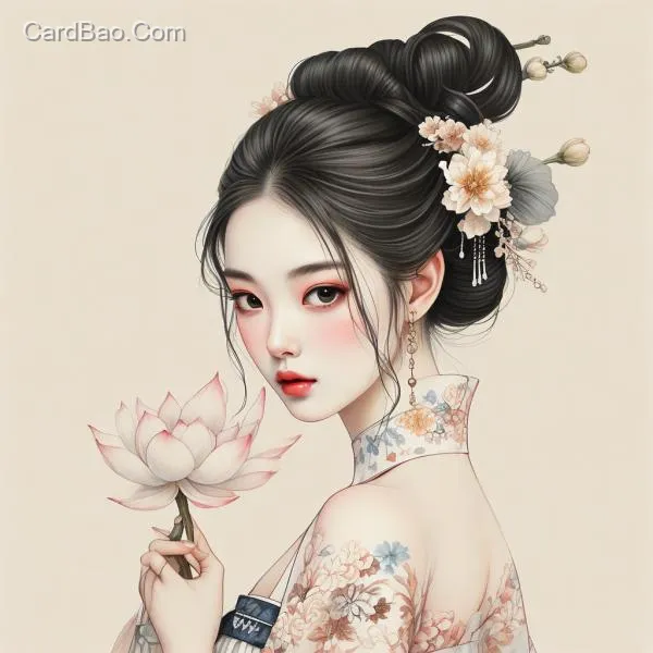 Oriental beauty avatar, elegance that outshines past and present, lotus flowers shy away from her jade-like face, minimalist cartoon style.