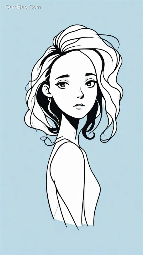 手绘插画风,极简,头像,宝蓝色背景,白色的人物剪影,卡通,少女侧脸,大波浪长卷发,线条