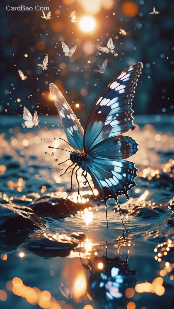A beautiful butterfly flutters over the gradually melting water surface, shimmering with a vivid, dreamlike silver-white glow—an unimaginable beauty.