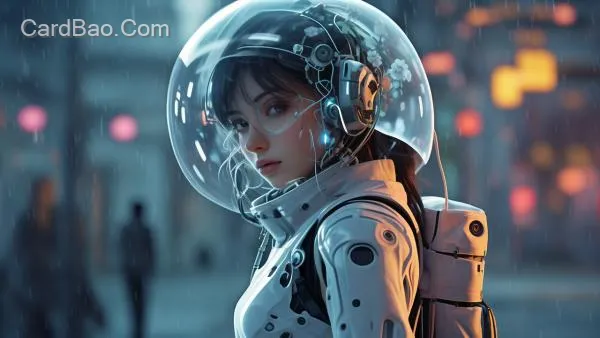A beautiful female robot with a gear-driven mechanical structure, made of semi-transparent frosted material. The entire body has a frosted, acrylic finish, featuring a transparent, immersive style. Futuristic and tech-savvy, it glows softly with pastel colors. The robot wears a jellyfish and mushroom-shaped spacesuit, complete with a backpack. On the front, there is a floral pattern, and the transparent, plastic foam-like hood contains flowers inside. Neon lights and holograms are integrated throughout. The overall aesthetic combines fashion photography with kawaii cuteness, characterized by soft colors and a cyberpunk anime style.