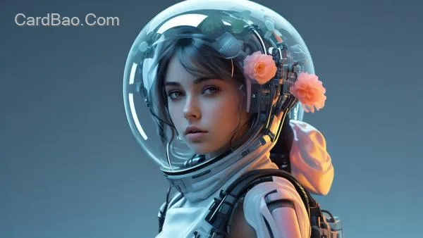 漂亮的女机器人,齿轮机械结构,半透明磨砂材质,通体磨砂,亚克力,透明沉浸式风格,未来主义,科技感,发光的,柔和颜色的水母和蘑菇形状的宇航服,背包,前面的花朵图案,透明的塑料泡沫状的兜帽,里面有花朵,霓虹灯和全息图。时尚摄影与卡哇伊美学,具有柔和的色彩和赛博朋克动漫风格