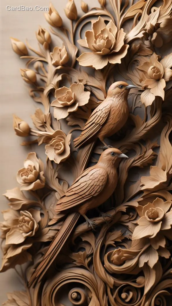 Wooden carved bird and wooden carved flower, texture details, high-definition close-up