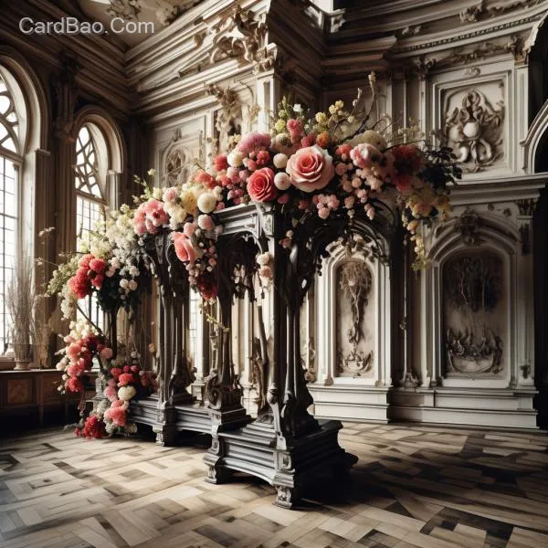 Tilted flower stand, opulent European hall, dimly lit