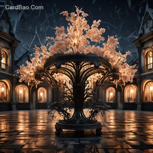 An overturned flower stand, an opulent European-style hall, night, dimly lit