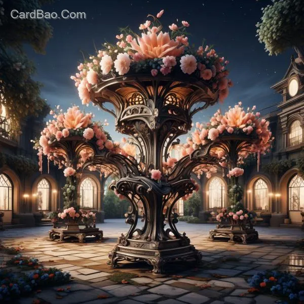 A toppled flower stand, an opulent European-style hall, night, dimly lit.