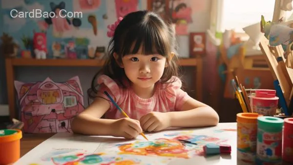 A 5-year-old little girl, beautiful, lively, and adorable, spends her days drawing countless pictures of little rabbits at her cute little desk in her own children's room. With her thoughts soaring freely, she is filled with immense joy, fully immersed in her passion for drawing these little rabbits.