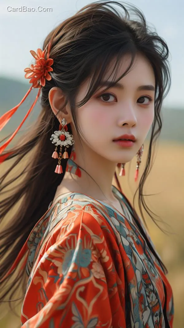 近镜头,一个非常漂亮的女孩,站在草原上,侧着身,脸看着镜头,戴着漂亮的耳环,穿着色彩鲜艳的古代衣服,半身照,风吹着头发,超高清,细节精致