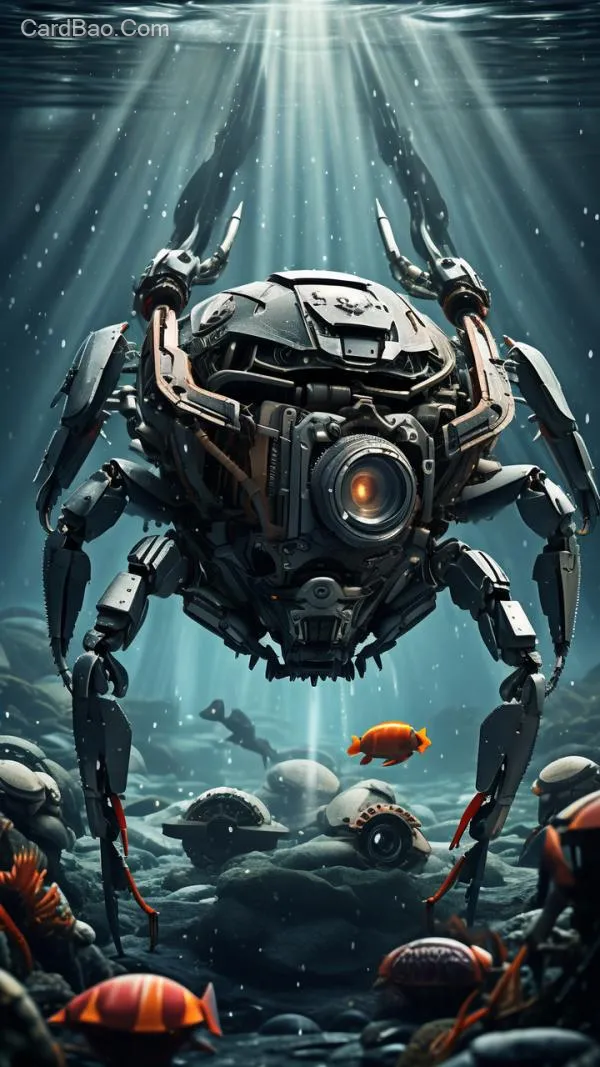 机械万物,相机实景拍摄,机械帝王蟹由精密的机械配件组合而成,线条感,对称结构,金属质感,齿轮,涡轮,简洁设计,机械工艺,机械构造,机械之美,赛博朋克,真实摄影,水下的阳光,丰富的水下环境