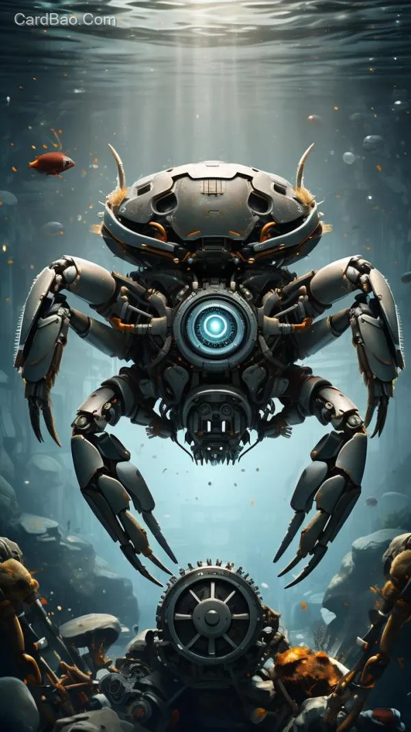 机械万物,相机实景拍摄,机械帝王蟹由精密的机械配件组合而成,线条感,对称结构,金属质感,齿轮,涡轮,简洁设计,机械工艺,机械构造,机械之美,赛博朋克,真实摄影,水下的阳光,丰富的水下环境