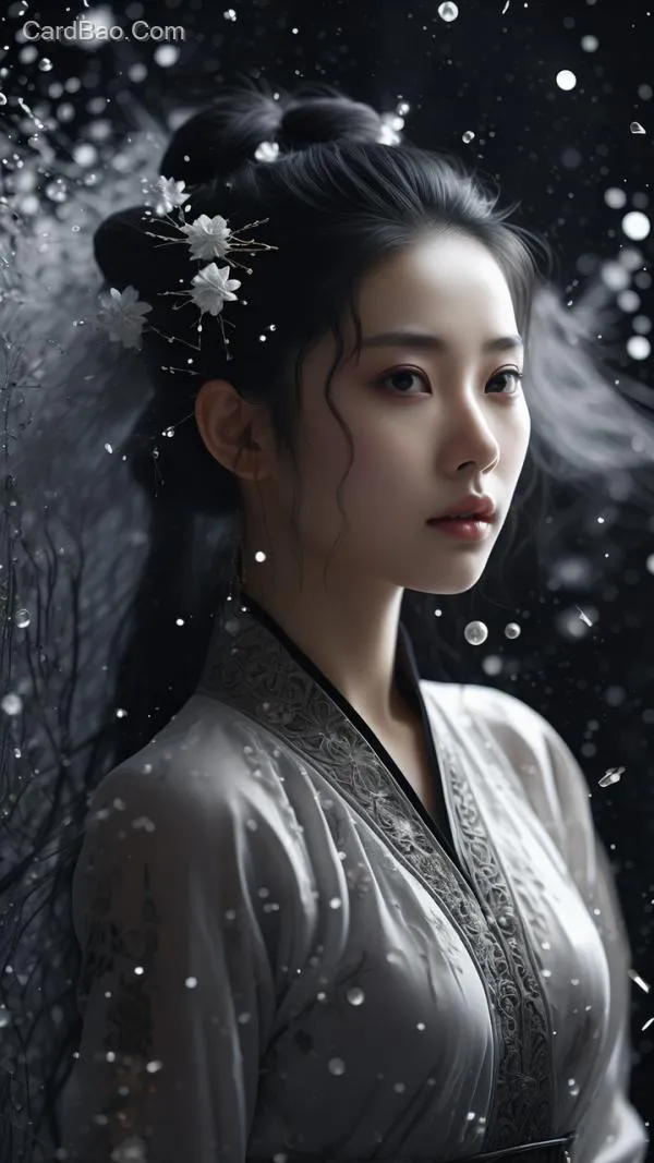 一个由幽灵粒子组成的一个中国古代美女,微小粒子,通透的质感,模糊边缘,双重影像,伽马射线捕捉,黑色背景,实景拍摄