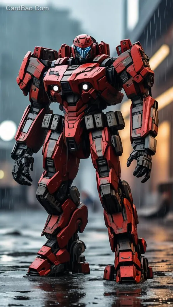 机甲,机体,光环士官长,特写镜头展示 ,真实,锈迹,工业,环境光,下雨天,上半身特写,近距离,狂暴状态,红色机甲