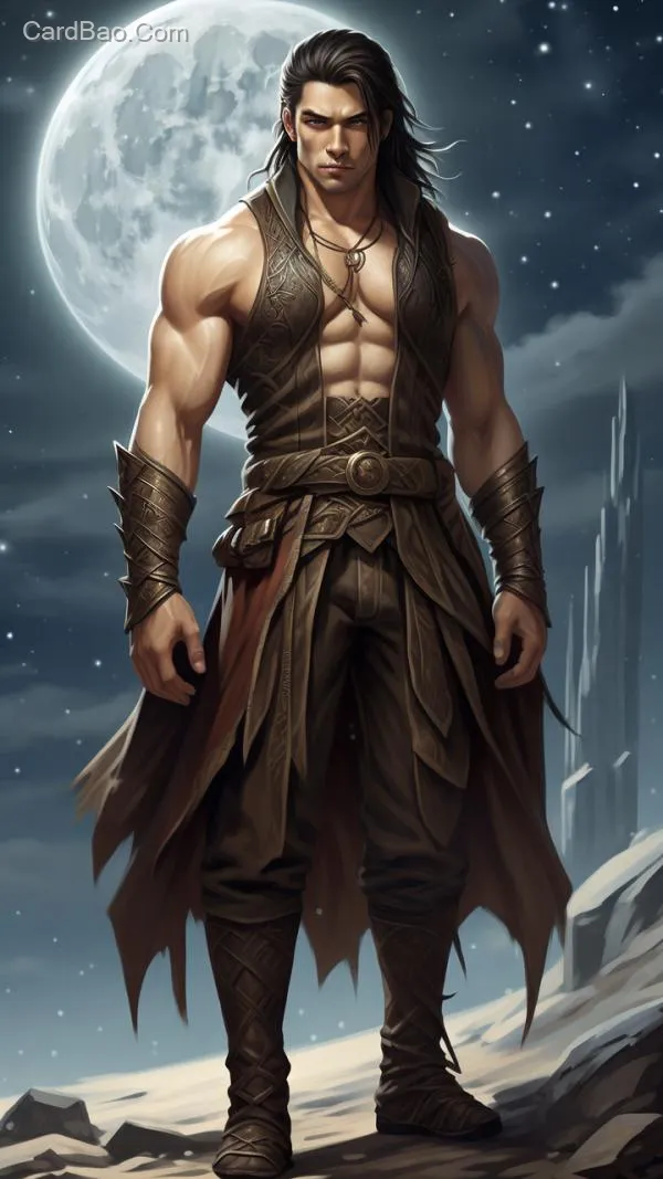 洁白光滑的皮肤,月精灵男性,较矮,肌肉扎实,黑发,紧贴头部的辫子,棕色的皮质背心,棕色的皮质裤子,棕色的皮质短靴