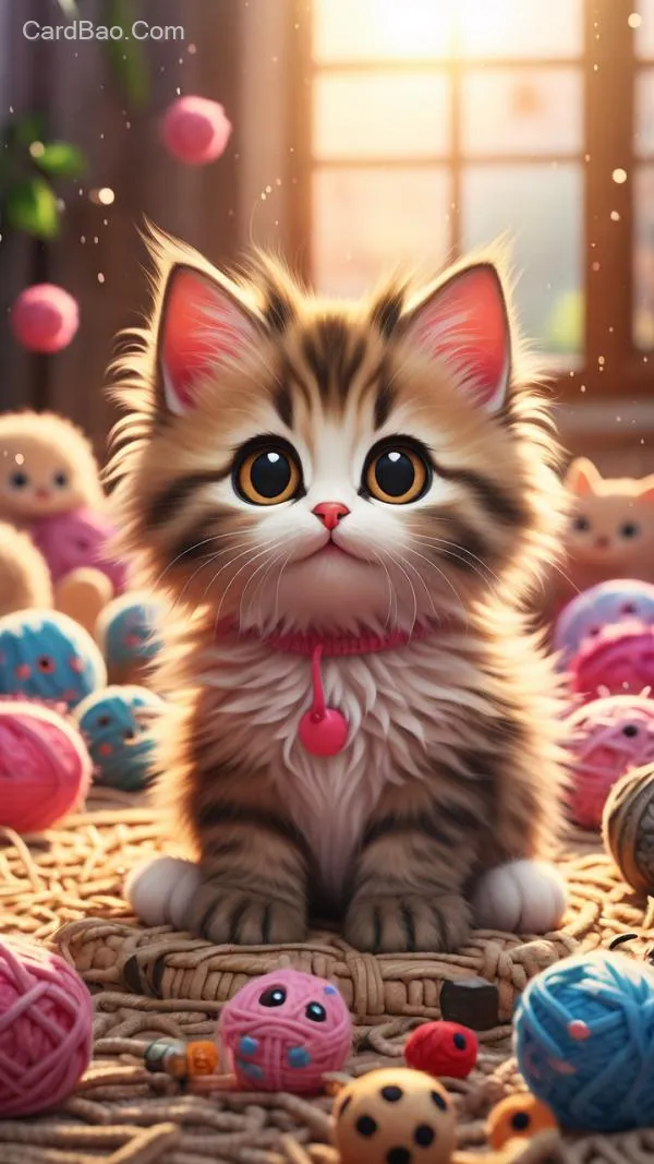 Cute Pet Kitten: High quality, adorable style, with big eyes, soft fur, a playful expression, a pink little nose, and fluffy ears. Sitting on a soft cushion, with sunlight gently shining on it, surrounded by some cute yarn balls and small fish toys.