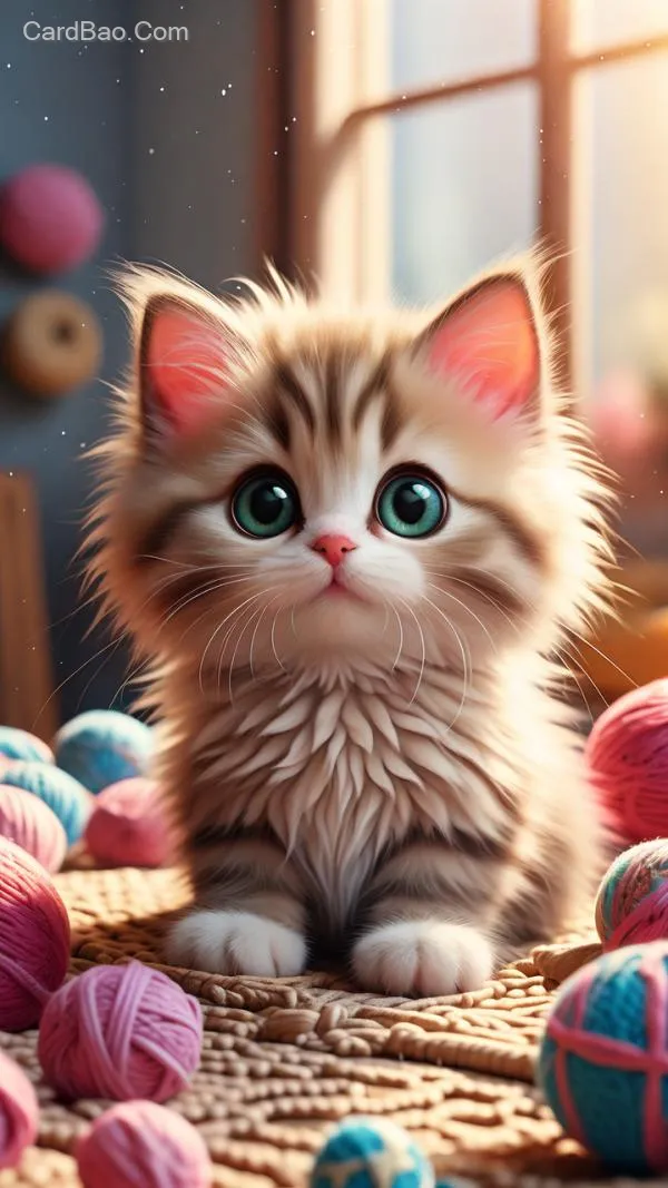 萌宠猫咪:高品质,可爱风格,大眼睛的猫咪,柔软的毛发,俏皮的表情,粉色的小鼻子,毛茸茸的耳朵,坐在柔软的垫子上,阳光洒在身上,周围有一些可爱的毛线球和小鱼玩具。