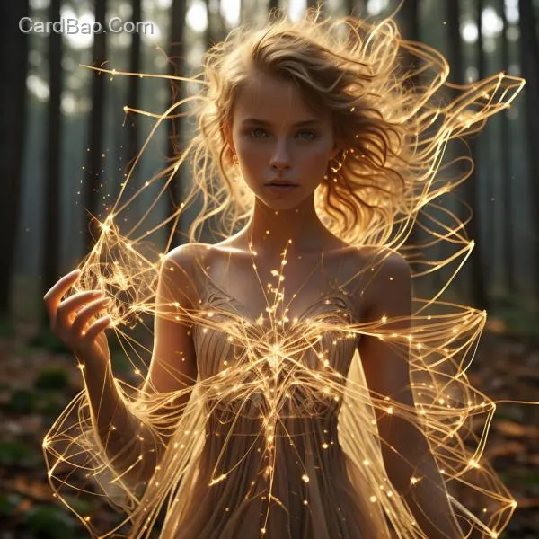Golden transparent thread magical effects, holding a mysterious card, European-American girl's back, forest.