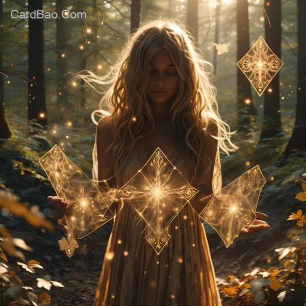 手持神秘卡牌,欧美少女背影,金色丝线魔法特效,森林