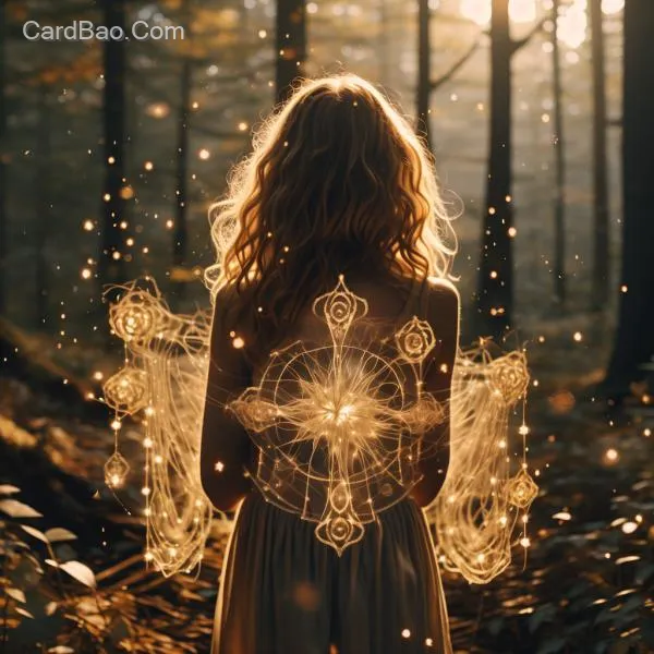 手持神秘卡牌,欧美少女背影,金色丝线魔法特效,森林