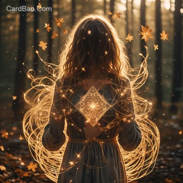 手持神秘卡牌,欧美少女背影,金色丝线魔法特效,森林