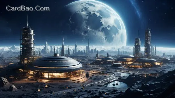 Lunar base and its ancillary structures, metallic tones, deep space background, colorful nebula, blue Earth