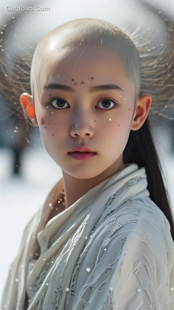 Oriental girl, head centered frontally, with a cute and delicate face, aesthetically pleasing, shaved bald head, wearing white cloth clothing, close-up realistic photography, 4K ultra-high resolution, fine texture.