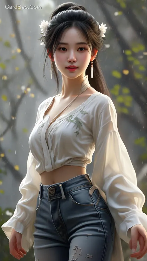 牛仔裤高腰美女,御姐型,仙气飘飘,清新脱俗,凹凸有致,身材娇好,3D立体,CG,白皮肤,微笑,超高分辨率,质感细腻