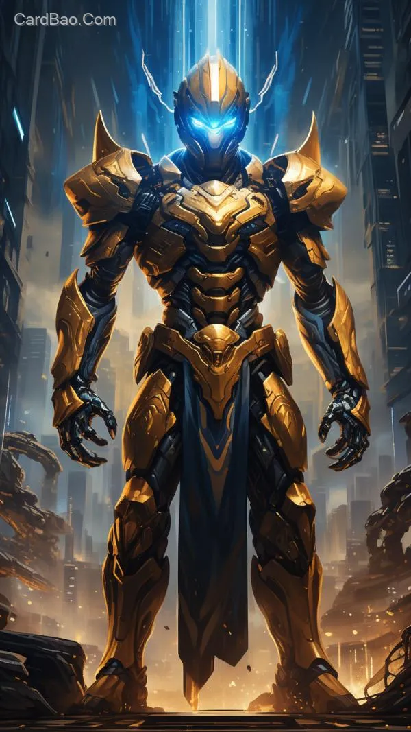高科技智能机器机械战神,身披金色盔甲,周围散发蓝色智能能量光环,背景为未来城市的夜景,细节丰富,极具未来感和震撼力。