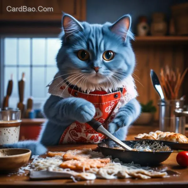 Blue Cat is in the kitchen, holding a spatula, frying fish, wearing an apron, and drooling.