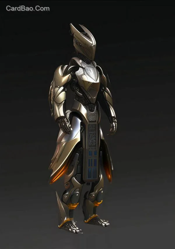 未来风格,穿着铠甲 ,金属光泽,身上有国潮元素,全景构图,高清,远视角,8k高清,手绘风格 丁达尔效应 背后金色光环装饰
