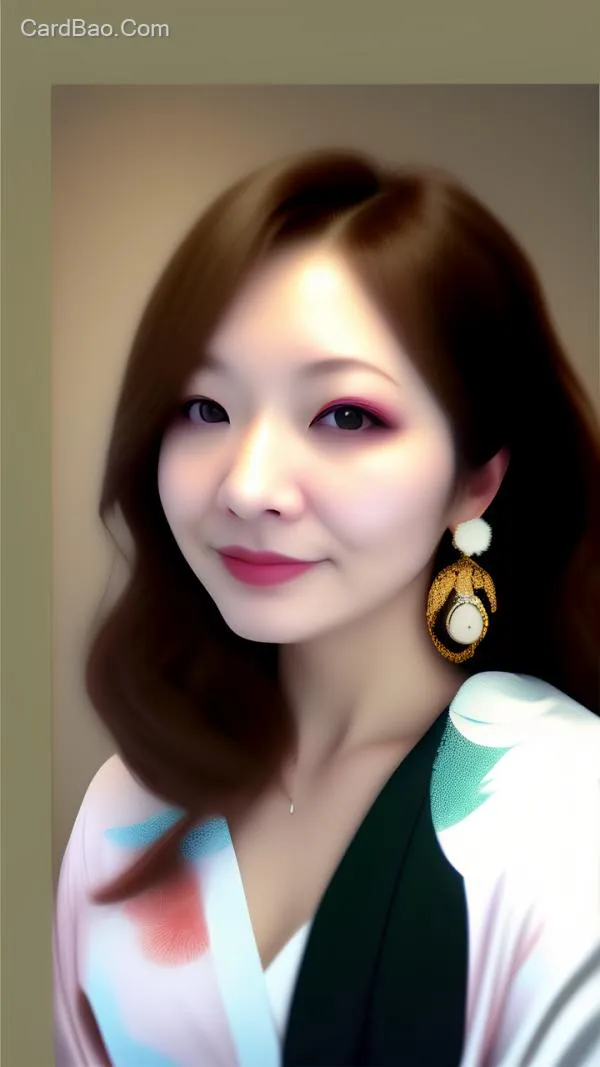 Young woman, wearing a kimono, still charming with a youthful aura, long hair, youthful appearance without wrinkles, cute, wearing earrings, solo photo, centered portrait.