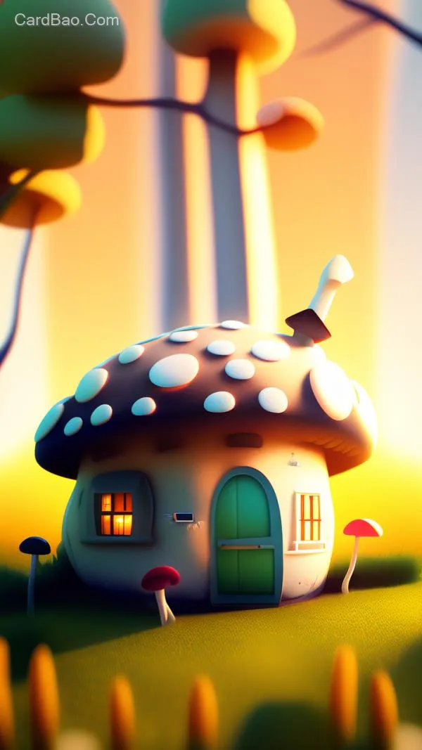 晨曦陽光照射蘑菇屋樹林和蘑菇屋