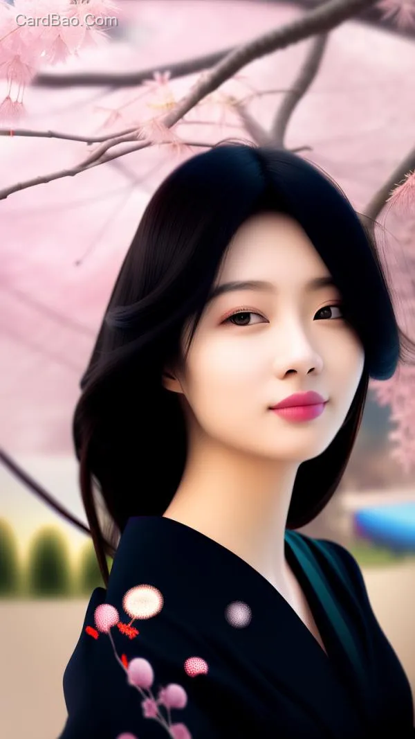 Portrait, wearing a black kimono with cherry blossoms, background featuring cherry blossom trees, 8k